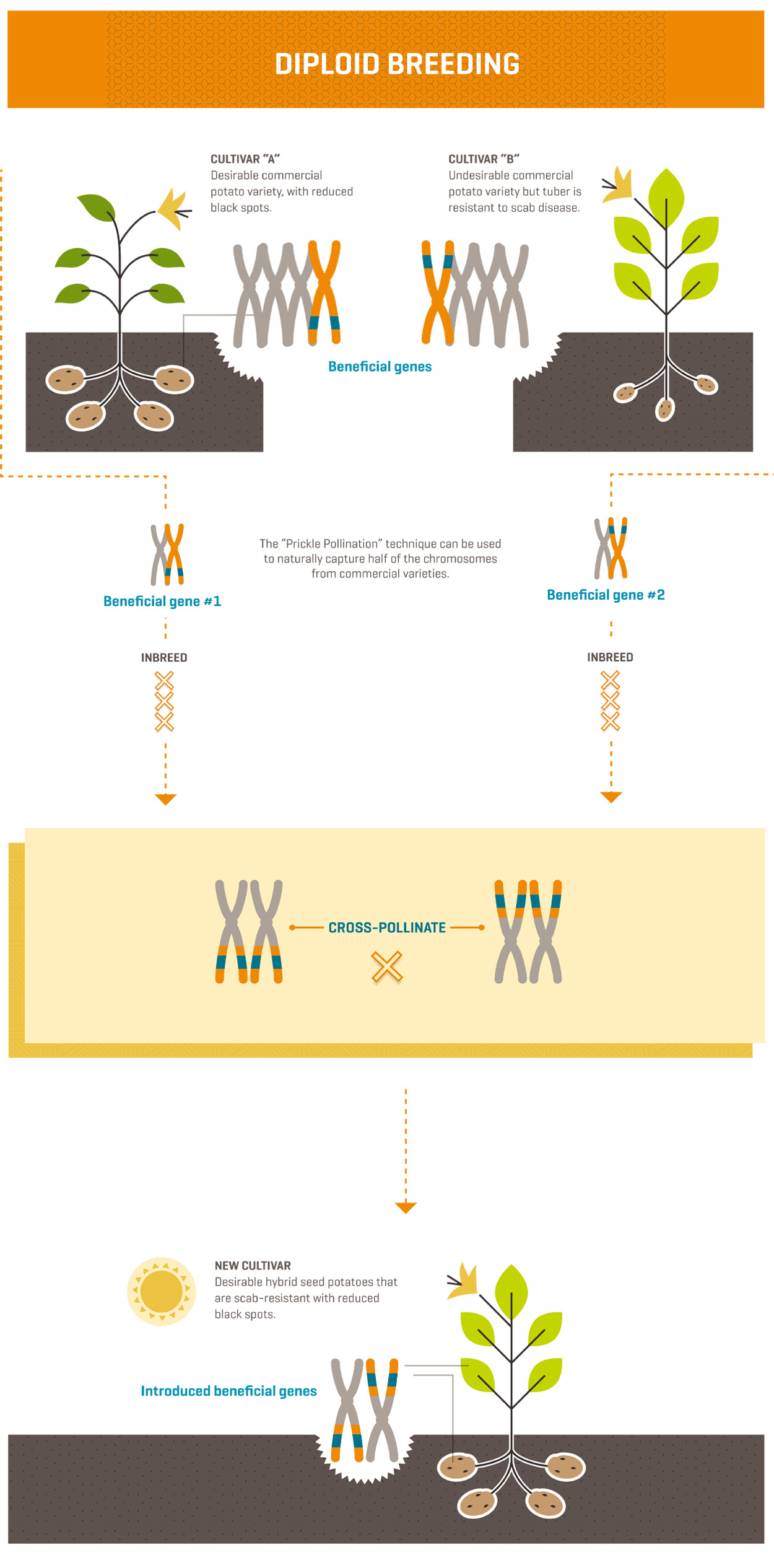 Due to the genetic makeup of potatoes, the breeding of a new variety currently takes up to 20 years. To speed up this process substantially, one of the goals set by Aardevo is the creation of diploid hybrid potatoes which are more amenable to faster genetic gains via breeding than their tetraploid counterparts. Furthermore, the long-term ambition is to provide farmers with true potato seed from which to grow potato plants. Using true potato seed for planting, instead of whole or cut-up tubers, has the potential to deliver more reliable starting material with decreased risk for disease and environmental benefits for storage.