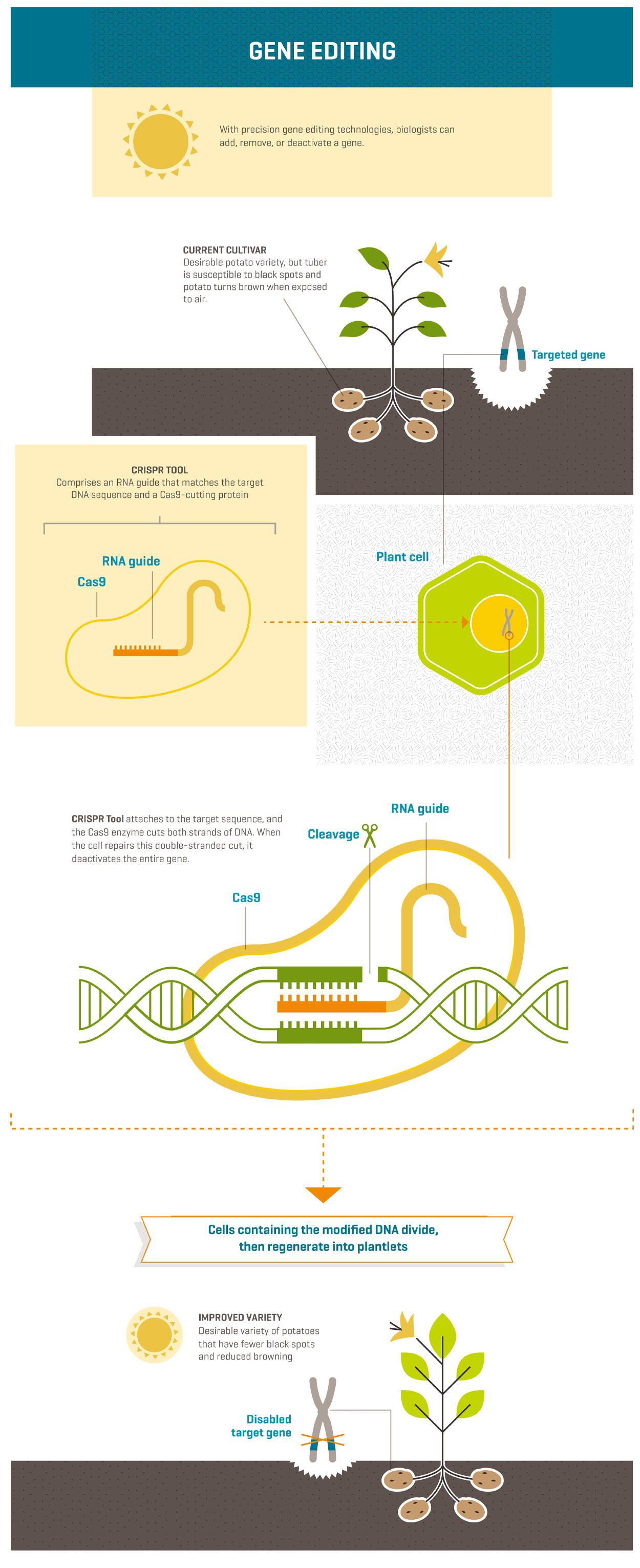 Gene editing tools may enable growers to obtain higher usable yields because of better quality potatoes. The sustainability benefits include using less land, fewer pesticides, water and labor while extending the quality of the potatoes.