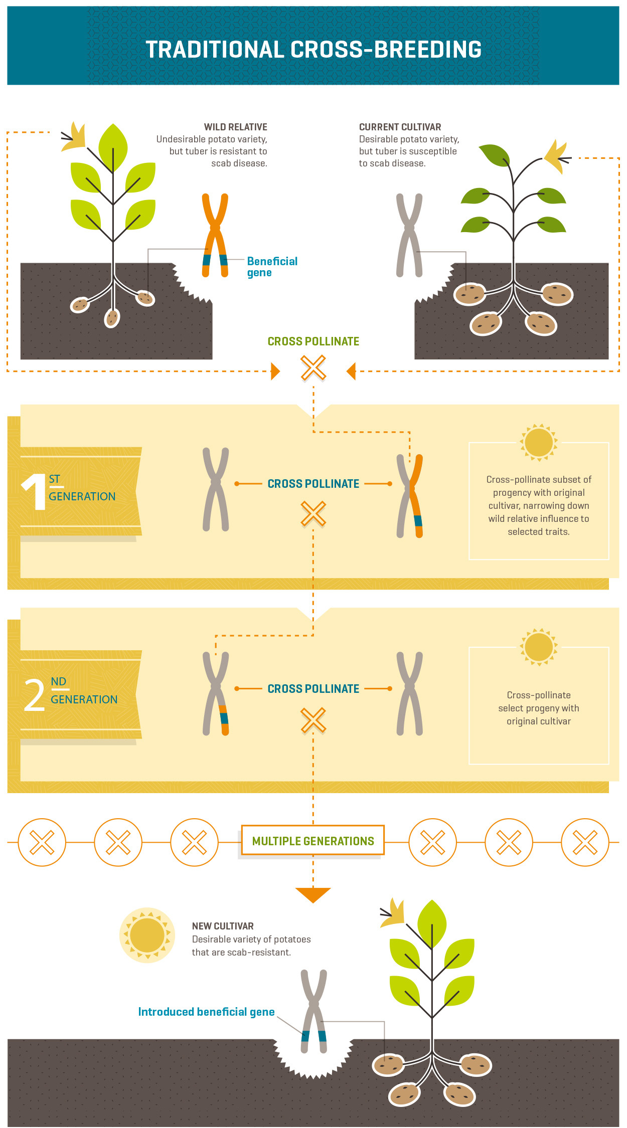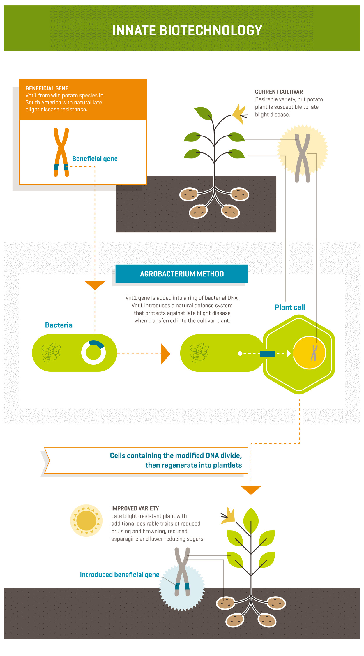 Innate® works with the potato’s own genome to achieve desirable traits. We’ve used modern biotechnology techniques to bring together some of the best traits from different types of potatoes. Pieces of potato gene related to certain traits such as the browning due to oxidation are added to the potatoes, causing the down-regulation of expression. The process effectively “turns-down” the volume of the gene without impacting any of the vital processes of the plant. These potatoes are grown just like any other potato plants on farms, but their tubers contain the improved traits.