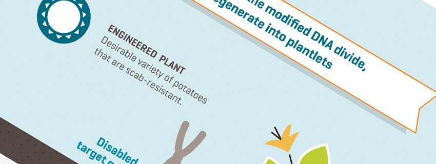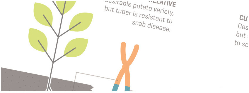 CRISPR-Cas9 is the name of a gene editing technology that uses “genetic scissors” to reduce a reaction that causes an undesirable result like dark colors in cut fruit. For example, in potatoes, we are able to reduce polyphenol oxidase leading to fewer black spots.
